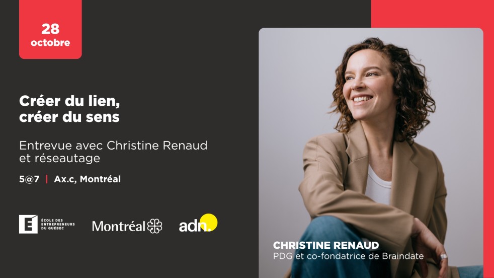 Entrepreneure montréalaise reconnue à l’international, Christine Renaud est la fondatrice de Braindate, une technologie pionnière qui transforme les événements en expériences de partage de connaissances entre pairs. Construite sans capital de risque, Braindate a été nommée parmi les entreprises les plus innovantes au monde par Fast Company en 2025, et finaliste de deux Webby Awards en 2023. Elle est aujourd’hui utilisée par des leaders mondiaux comme Salesforce, TED, SXSW et NVIDIA.